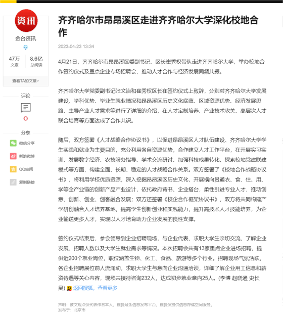 【金台咨询】齐齐哈尔市昂昂溪区走进欧冠官方网站深化校地合作