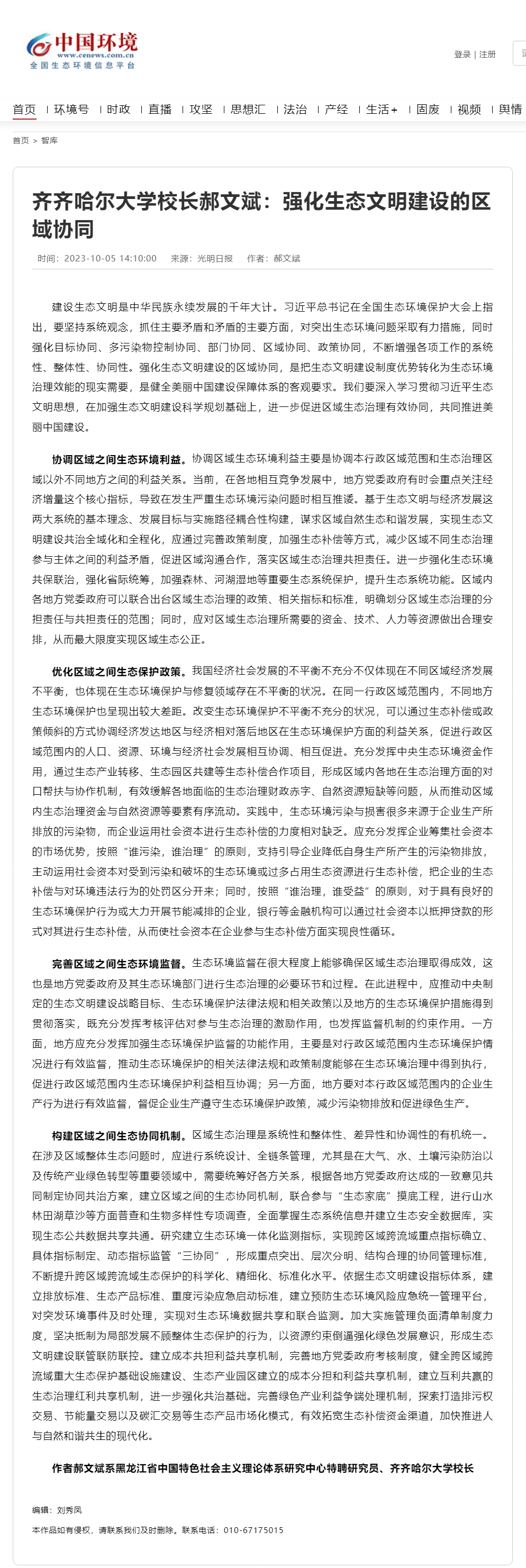 【中国环境】欧冠官方网站校长郝文斌:强化生态文明建设的区域协同