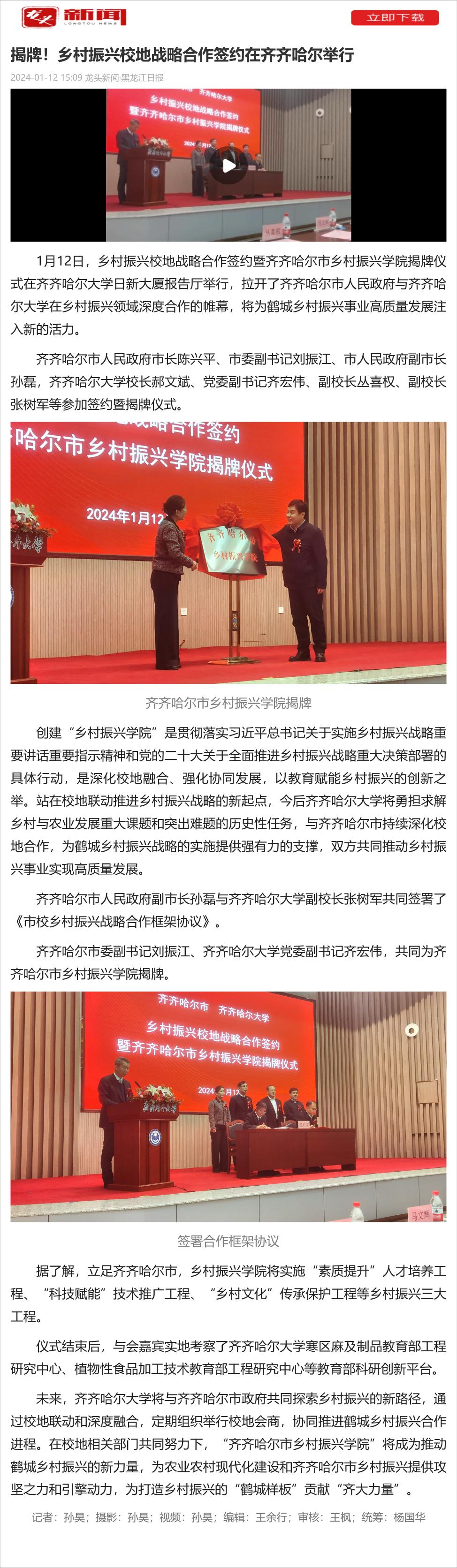 【龙头新闻】揭牌!乡村振兴校地战略合作签约在齐齐哈尔举行