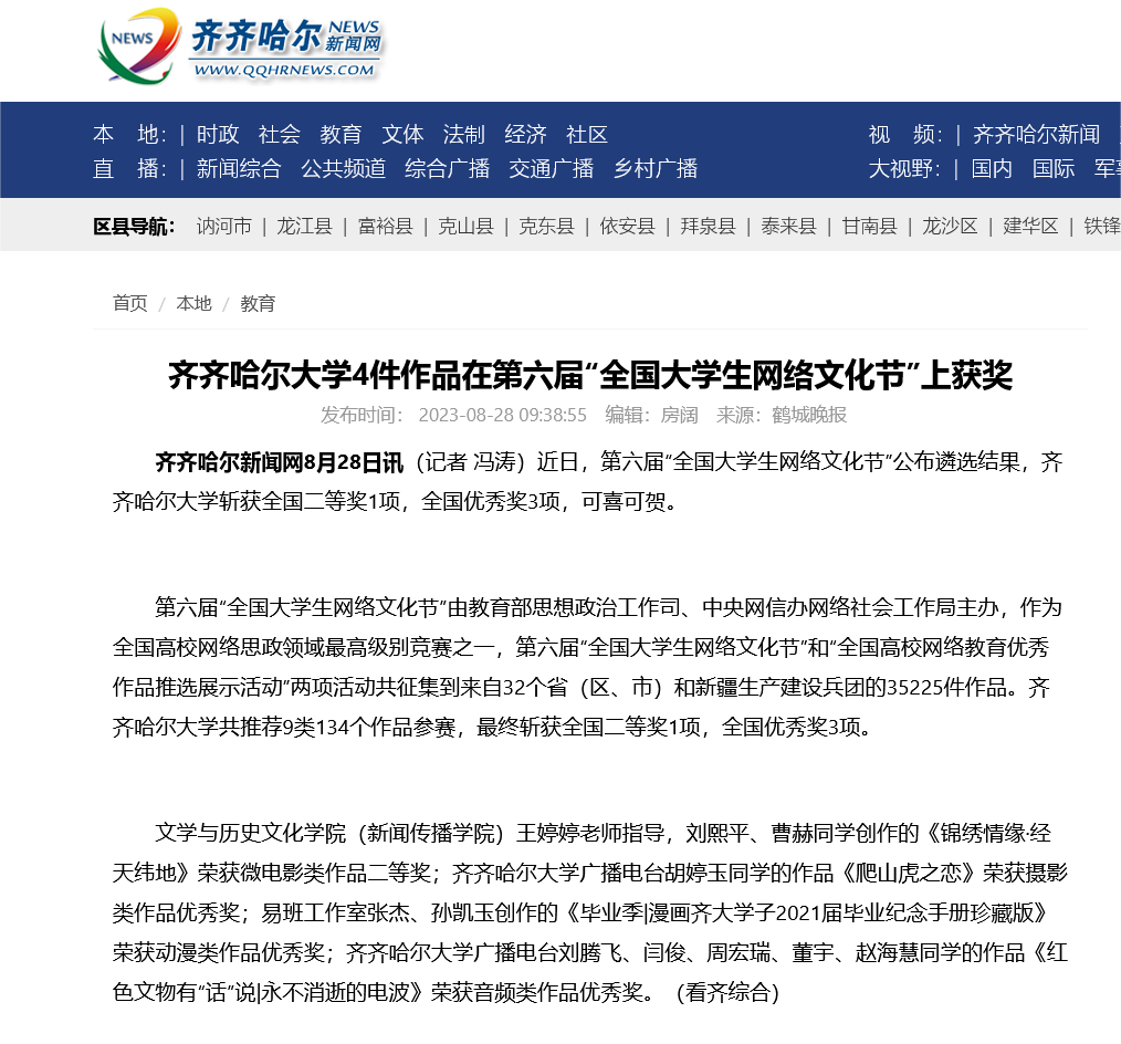 【齐齐哈尔新闻网】欧冠官方网站4件作品在第六届“全国大学生网络文化节”上获奖