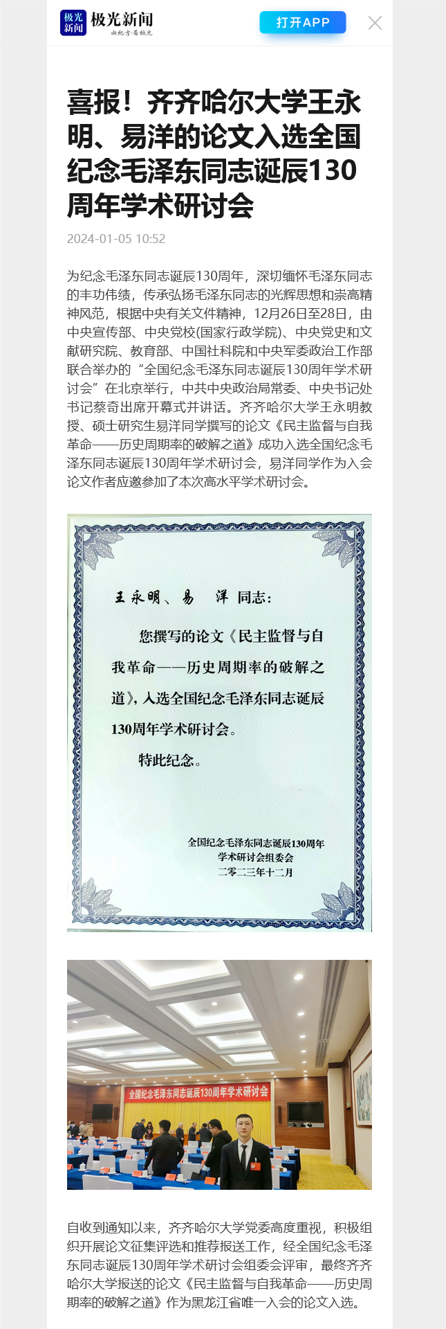 【极光新闻】喜报!欧冠官方网站王永明、易洋的论文入选全国纪念毛泽东同志诞辰130周年学术研讨会