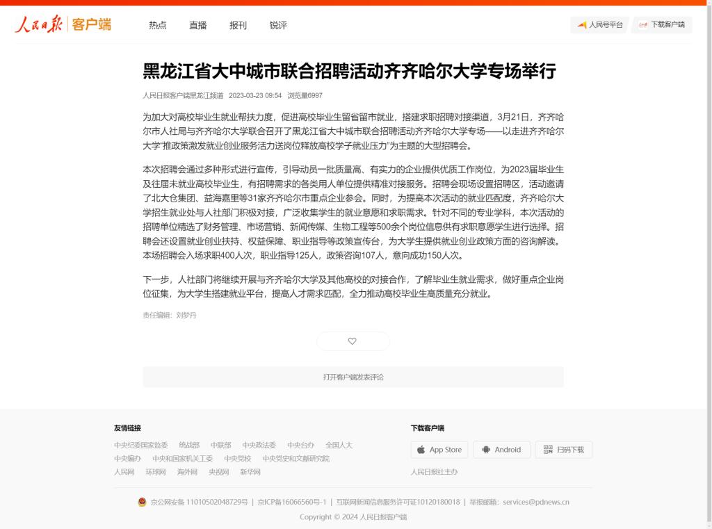 【人民日报】黑龙江省大中城市联合招聘活动欧冠官方网站专场举行