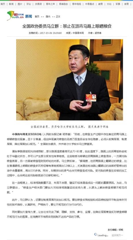 【中国青年网】全国政协委员马立群:禁止在沥青马路上晾晒粮食